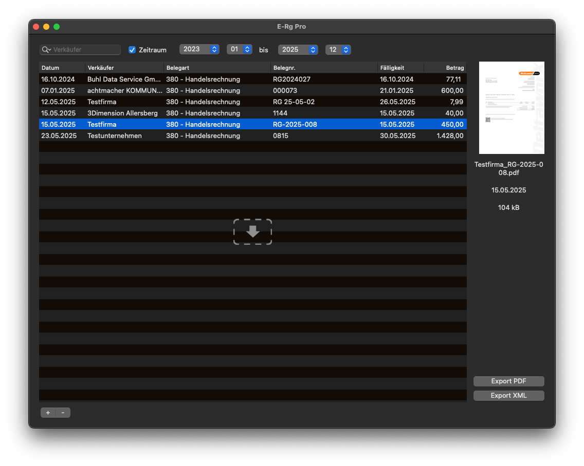 E-Rg Pro wurde extra entwickelt, um allen Geschäftskunden, die der neuen E-Rechnungspflicht ab dem 1.1.2025 unterliegen, ein kostengünstiges und einfach zu bedienendes Programm an die Hand zu geben, das ihre eingehenden E-Rechnungen speichert und revisionssicher verwaltet.