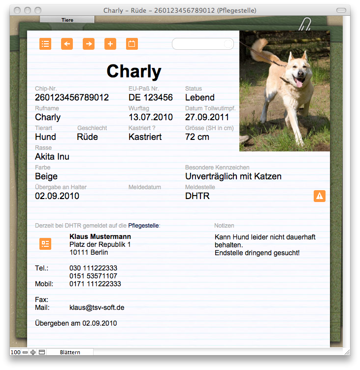 Heimtierregister läuft auf Windows (ab XP Servicepack 3) und Mac (ab MacOS X 10.6.8) sowie auf dem iPad mit FileMaker 12 Go und kostet 20,- Euro.